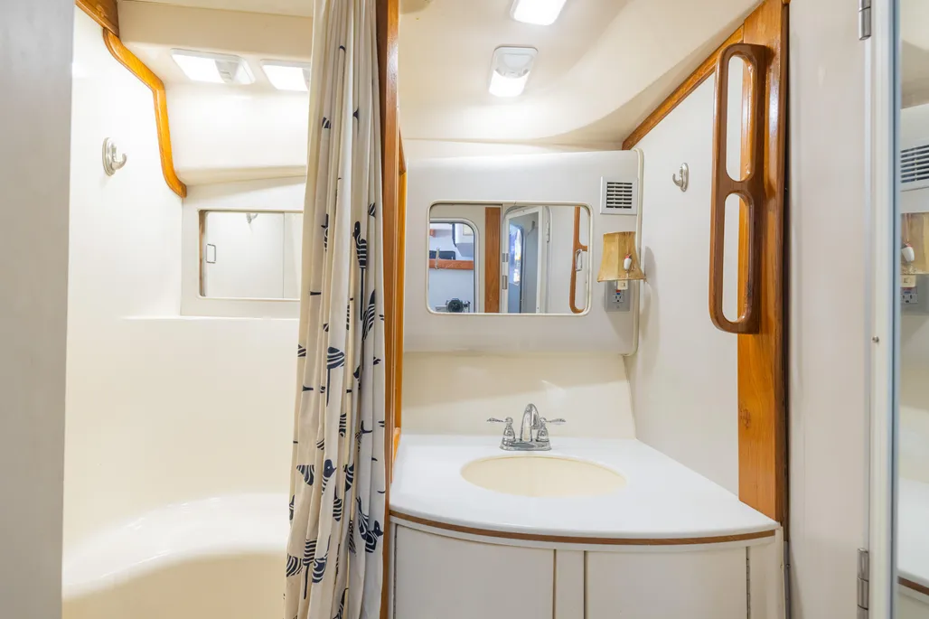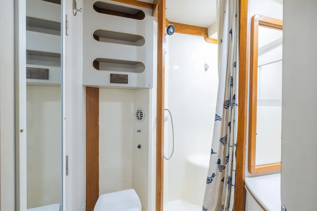 - Head: Enclosed with a marine toilet, sink, and shower.