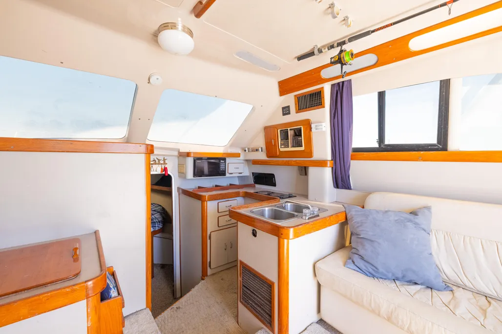 - Galley: Equipped with a two-burner stove, microwave, refrigerator, and sink.