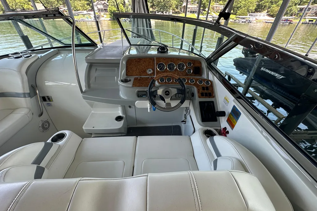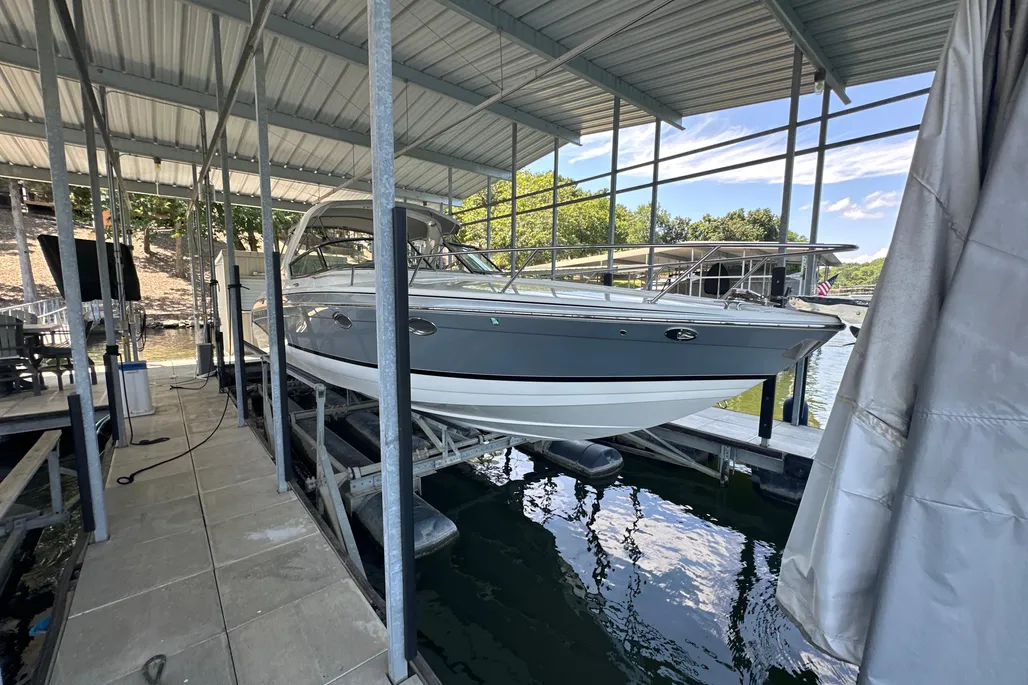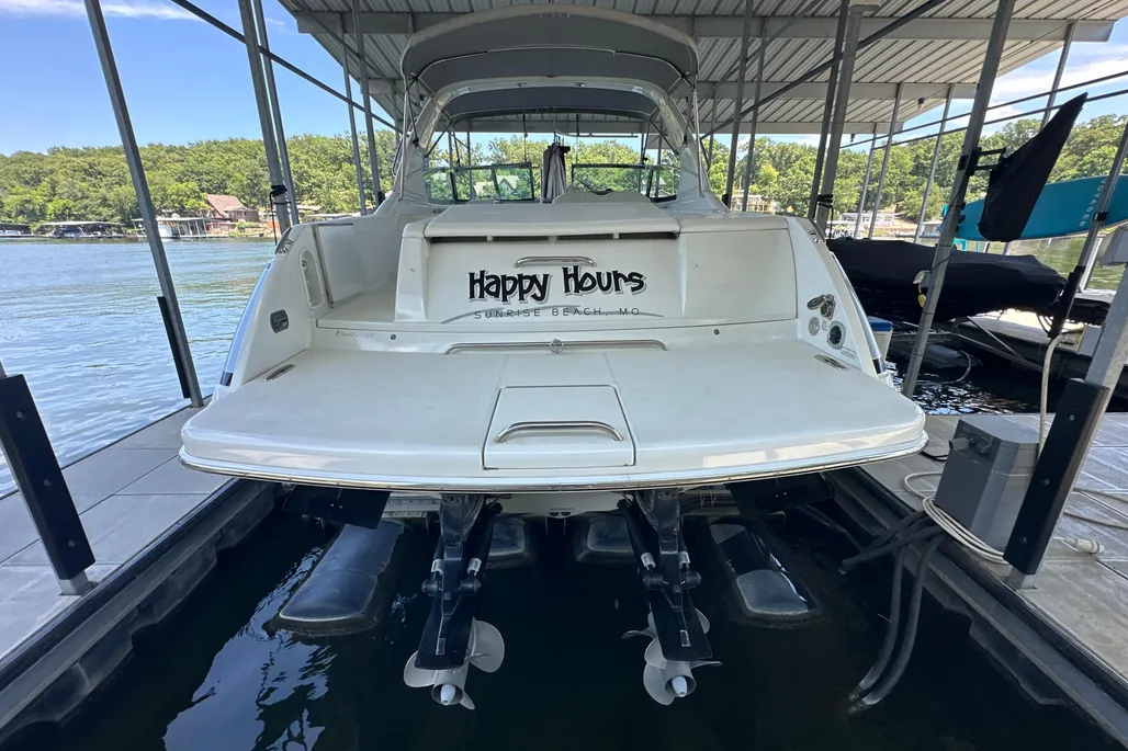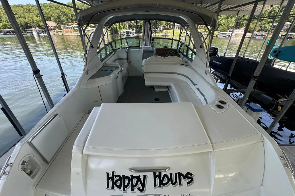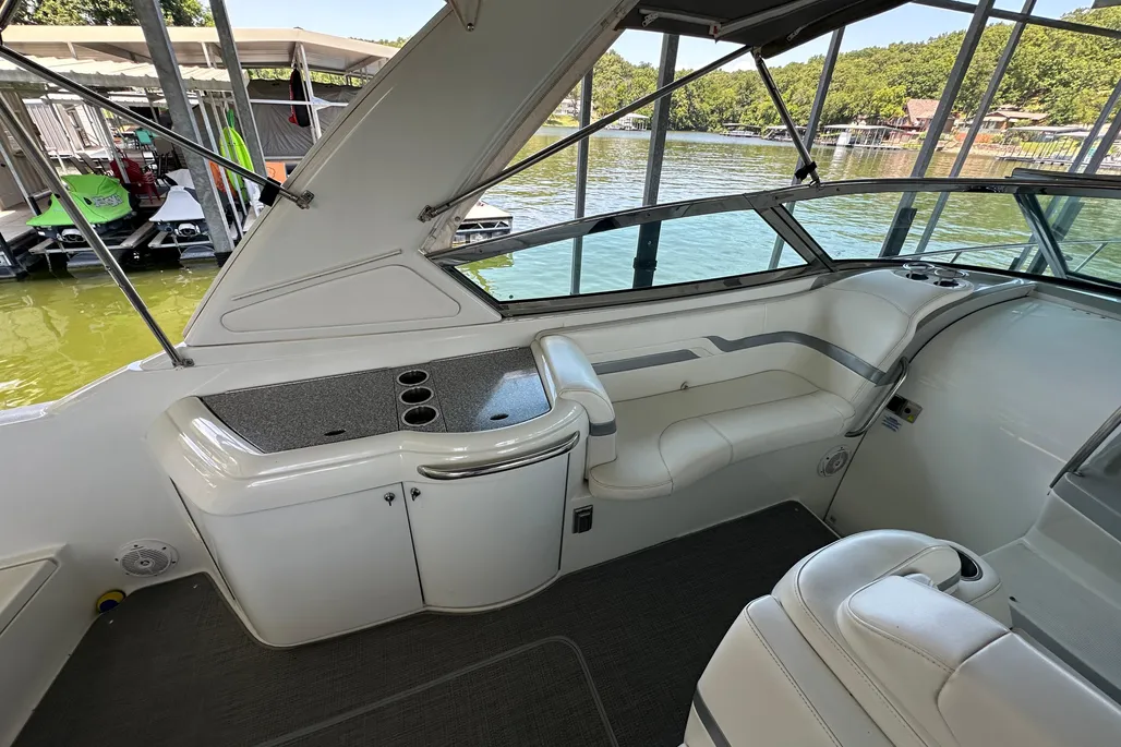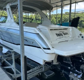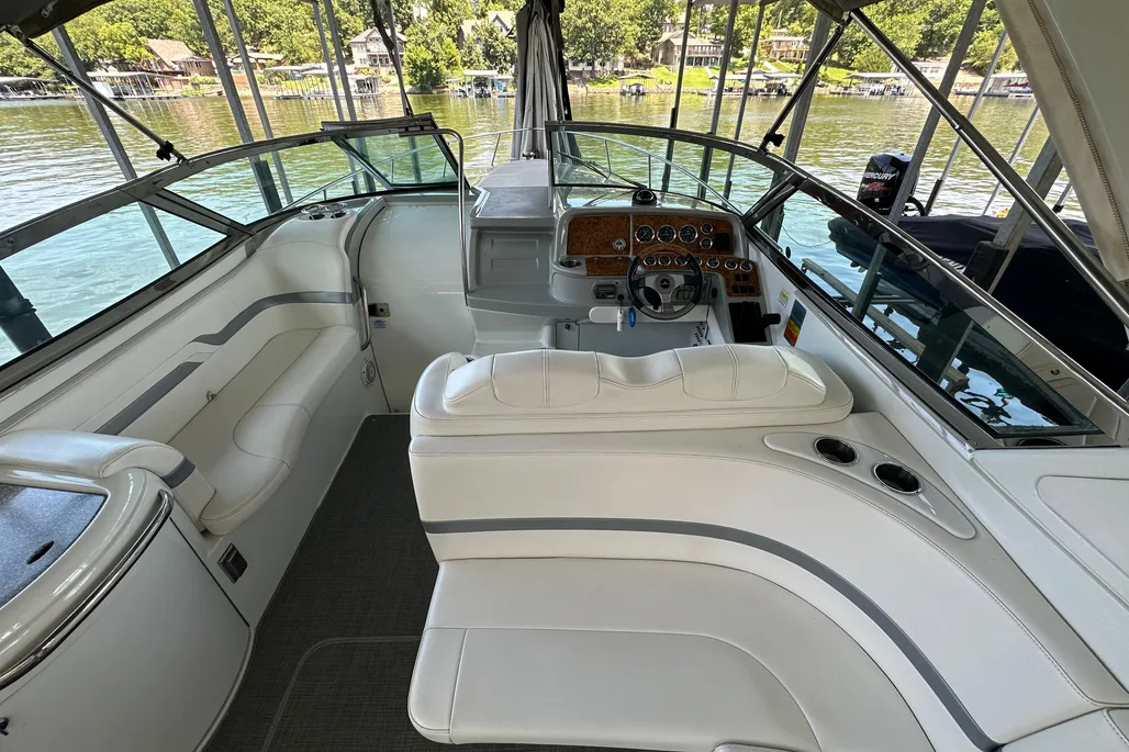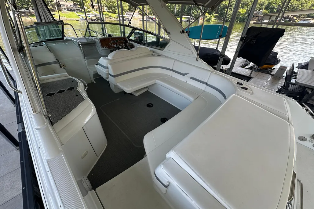 With her sleek lines and roomy cockpit, the Formula 330 Sun Sport will appeal to those seeking a high-style family sportboat with the emphasis on open-air fun. She's well constructed on a deep-V hull with generous beam, and the subtle-but-colorful hull graphics do much to accent her low-slung appearance. The spacious cockpit of the Formula 330 is really what this boat is all about. The accommodations are very practical below with the U-sahped Ultraleather settee/dinette forward, an enclosed head compartment, and an entertainment center-accommodations well suited for her day boat mission. The cockpit table at the transom converts into a wide sun lounge. A good performer that has been lift kept and undercover her whole life.