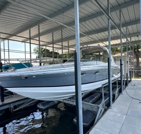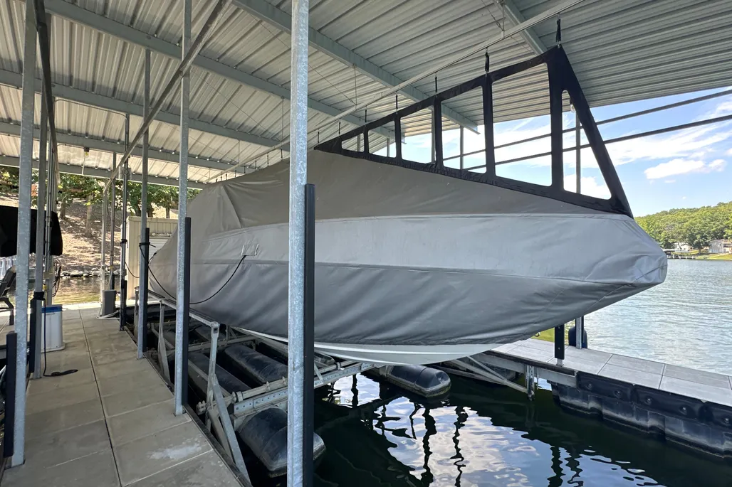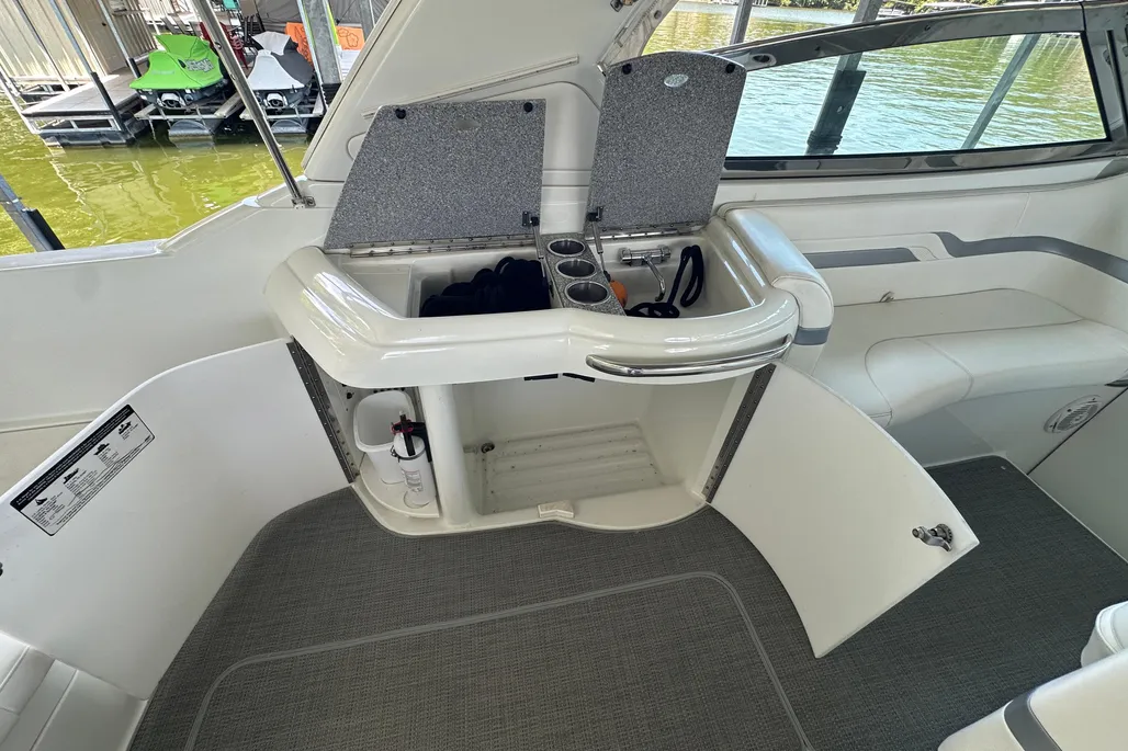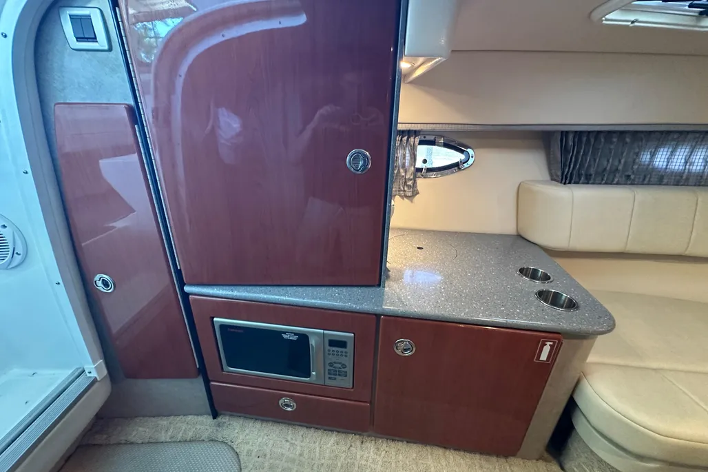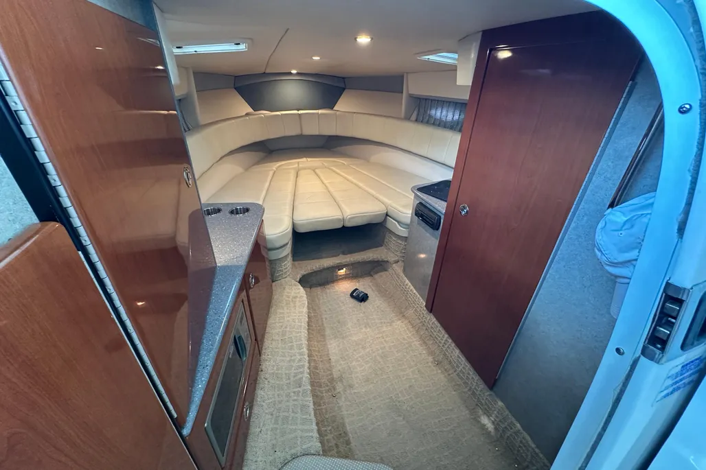 V-berth forward with fillers that convert to dinette. Combo head to starboard with Vacuflush head. Galley to port with refrig and microwave. Large cockpit with wet bar and refrig. Lots of seating. Walk-thru windshield with the high bow rails. Extended swim platform with ladder. Stainless windshield.